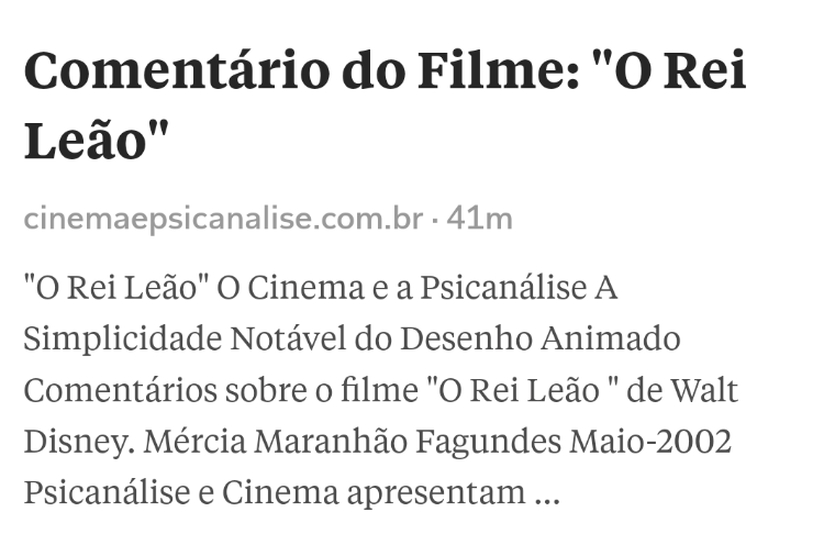 "O Rei Leão" O Cinema e a Psicanálise A Simplicidade Notável do Desenho Animado Comentários sobre o filme "O Rei Leão " de Walt Disney. Mércia Maranhão Fagundes Maio-2002 Psicanálise e Cinema apresentam uma relação íntima que tem sido reconhecida há algum tempo. Isso se deve muito provavelmente ao fato de a leitura psicanalítica poder iluminar o significado de um filme. Através da teoria da clínica psicanalítica pode-se desvendar o que está acontecendo na tela. Certamente, ao se realizar esse trabalho não se pretende chegar a uma leitura definitiva, ou seja, não se propõe encontrar uma verdade absoluta. Pretende-se, sobretudo, ampliar as possibilidades de interpretação de alguns episódios. Assim como com todas as formas de arte, através do contato com o cinema também conhecemos um pouco de nós mesmos. De certa forma o filme revela a linguagem do inconsciente e tem se tornado uma fonte vastíssima para o conhecimento e estudo das imagens psicológicas do nosso tempo. Assistir a um filme e interpretá-lo tem para a audiência contemporânea a mesma utilidade que a tragédia teve para os gregos por cinco séculos. A tragédia não só produzia catarse, mas também criava uma oportunidade de unir a audiência a sua cultura, através de dimensões mitológicas. E assim da mesma maneira que Aeschylus ou Sophocles proveram uma conscientização para os cidadãos de Athenas, pode-se dizer que os cineastas despertam nossa capacidade crítica não só em relação ao nosso meio, mas também em relação a nós mesmos. Eu acredito, que nesses encontros em que apontamos nossos olhares para o Cinema e o comentamos podemos estar vivendo uma experiência similar. Essa experiência de assistir um filme, pensar e conversar com a audiência sobre ele abre um espaço para a própria mente exercitar movimentos. Nesse processo podemos nos identificar, de maneira prazerosa ou não, com os sentimentos apresentados, conhecendo e desvendando nossos próprios mitos pessoais e os do nosso tempo. Segundo Levi-Strauss , mitos são transformações de conflitos fundamentais, ou contradições, que não podem ser resolvidos na realidade e por isso são transformados em símbolos. Considerando tal afirmação pode-se dizer que o filme disponibiliza soluções através das quais se realizariam os desejos, se dissolveriam muitos dos dilemas humanos. Isso me faz pensar que nesse momento participamos de um evento de uma maneira muito ativa, ou seja, ao assistirmos um filme não nos deparamos apenas com a tentativa de entretenimento. No escuro do cinema, mantendo uma certa distância de nós mesmos e de nossa realidade cotidiana, nos é possível vencer a nossa própria ansiedade através da empatia que se estabelece com o personagem e sair, portanto, enriquecido e aliviado. Freud tinha algumas reservas em considerar o cinema como arte, porém não desencorajou seus discípulos a se envolverem com produções cinematográficas que trataram, inclusive, de seus trabalhos sobre os sonhos. No início dos anos 50, psicanalistas observaram que o estudo psicológico do cinema pode ser tão interessante e útil para o conhecimento do funcionamento da mente, como foram as aplicações do pensamento psicanalítico, realizadas por Freud, às peças de Shakespeare, Ibsen e Sophocles. Talvez, fosse possível até nos determos sobre questões dessa natureza e conversar longamente sobre elas, porém, do meu ponto de vista, como pediatra e psicanalista, especialmente frente a um desenho animado, outras questões ganham maior relevância. Como psicanalista sou pressionada, pela necessidade de cuidar do sofrimento do meu cliente, a dividir com ele a vivência de um quantum da sua angústia. Em cada sessão de análise vou ao encontro de sua dor mental. Nesse sentido, vejo o acesso da criança ao cinema, especialmente ao desenho animado, como um meio auxiliar na tentativa de digerir um pouco do que ainda até então, não encontrou espaço mental para ser expresso e compreendido. O cinema tem trazido mais e mais, especialmente para a criança muito pequena, a possibilidade de se identificar com um personagem e através dele conscientizar-se de algumas situações. Elas vêem no personagem um recipiente em que colocam suas emoções, muitas vezes, violentas e desconhecidas. Esse é um recurso através do qual elas cuidam de sua mente e aprendem a respeitá-la. Elas normalmente escolhem, se identificam com alguns personagens e passam a se referir a eles com desenvoltura e intimidade. Em determinado momento são, freqüentemente, tomados como ponto de partida para elaboração de muitas situações conflitantes. Todos nós, que convivemos com as crianças sabemos como elas adoram assistir e assistir a seus filminhos e como se aliviam e se tranqüilizam depois disso. Isso, na verdade, não acontece só com elas. Eu detecto mesmo como algo peculiar do ser humano a dificuldade de expressar suas emoções. Muitas vezes, o que nos resta é viver momentos em que nos sentimos completamente soterrados por elas. É quase uma guerra travada a cada momento. A tentativa de fazer com que as emoções caibam nas palavras e no tempo delas, para que possamos comunicá-las e, então, estabelecer nossos contatos com outras mentes e com próprios nossos vínculos é extremamente difícil. Se não conseguimos encontrar um modo de fazê-lo, nossa mente explode em angústia e sobrevem a loucura. Às vezes vivemos microexplosões mentais, que se não respeitadas podem causar desastres maiores. Poderia dizer também que quanto menor nossa experiência de vida e nossa performance em viver momentos de tensão e dor, ou seja, quanto maior a imaturidade, com certeza, será maior a angústia. Na criança, consequentemente, a turbulência emocional atinge seu grau máximo. Isso se deve a sua imaturidade, acrescida da grande fluidez da sua mente e da extrema plasticidade mental(que consiste na propriedade de adquirir determinadas formas sensíveis, p